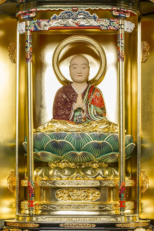 本堂内には中央に本尊阿弥陀如来、向かって右脇に観音菩薩、左脇に勢至菩薩、その外側にはお厨子に善導大師、法然上人の二祖像を奉安させていただいております。
