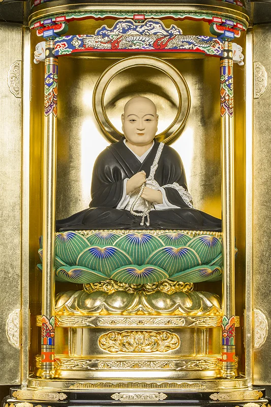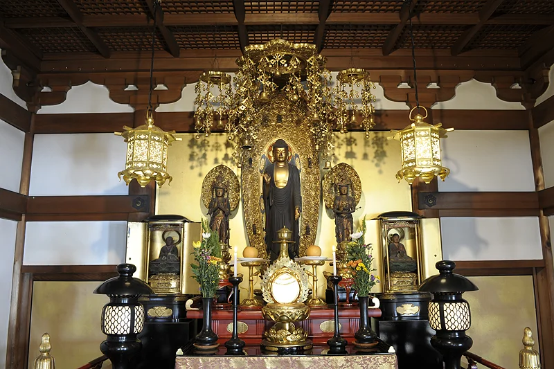 本堂内には中央に本尊阿弥陀如来、向かって右脇に観音菩薩、左脇に勢至菩薩、その外側にはお厨子に善導大師、法然上人の二祖像を奉安させていただいております。